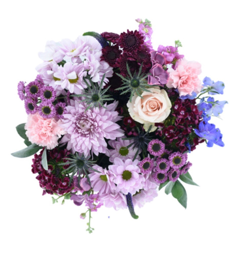 La receta del ramo incluye: 1 flor morada de tipo especial (Purple Novelty), 2 micropompones morados, 2 margaritas rosadas, 1 crémon lila, 1 delphinium azul, 1 cardo azul, 2 stocks rosa oscuro, 2 verónicas moradas, 2 sparkz malva, 2 bolas de dianthus borgoña, 1 rosa durazno, 2 claveles rosados y 2 ramitas de ruscus blanco teñido.