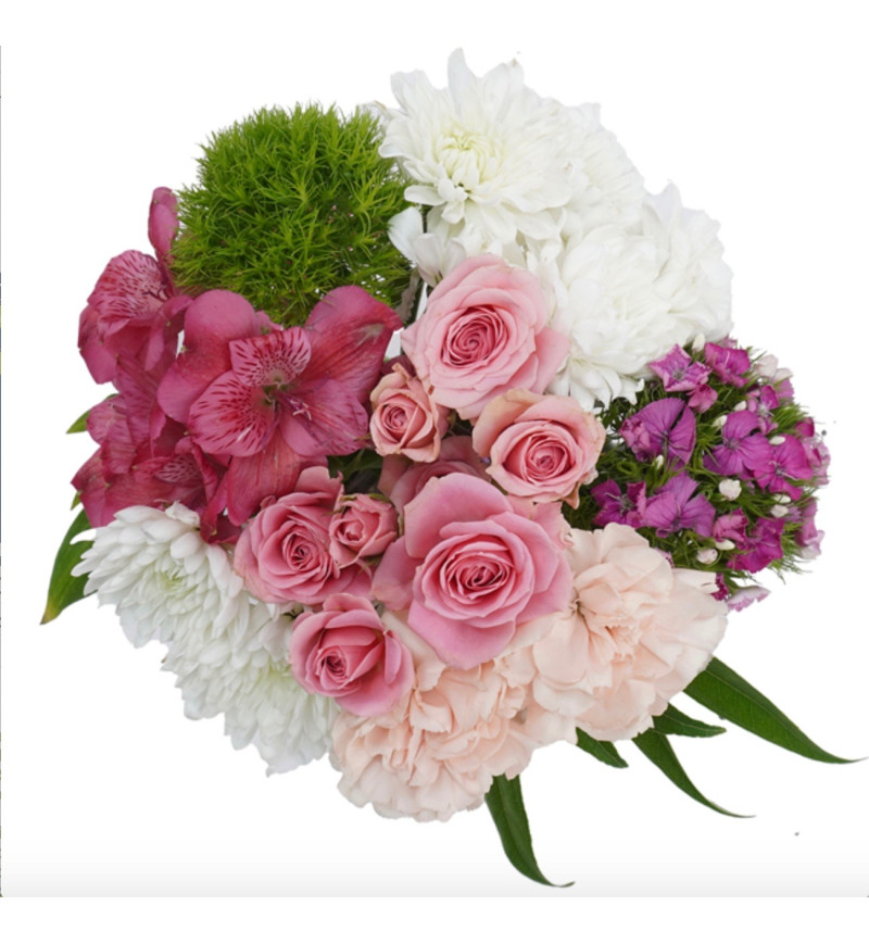La composición del ramo incluye: 1 rosa en ramillete rosada, 2 claveles durazno, 2 crisantemos blancos tipo cushion, 1 alstroemeria fucsia, 1 dianthus verde, 1 dianthus fucsia y 1 ramita de cocculus verde.