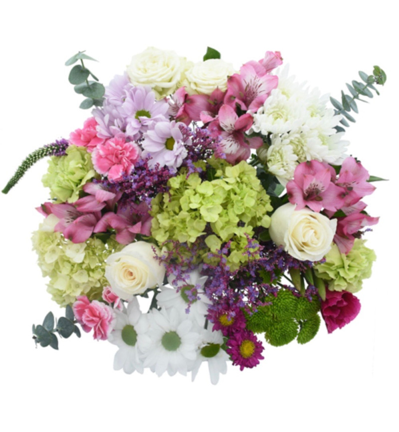Bouquet recipe includes: 2 Green Hydrangea, 2 Green Carnations, 1 Dark Pink Matsumoto, 3 Dark Pink Alstro, 1 White Daisy, 1 White Cushion, 2 Tintinted Pink Limo, 1 White Spray Rose, 3 Eucalyptus, 1 Pink Novelty Mini Carnations, 2 White Rosses, 1 Green Novelty, 1 Dark Pink Godetia and 1 Pink Veronica.