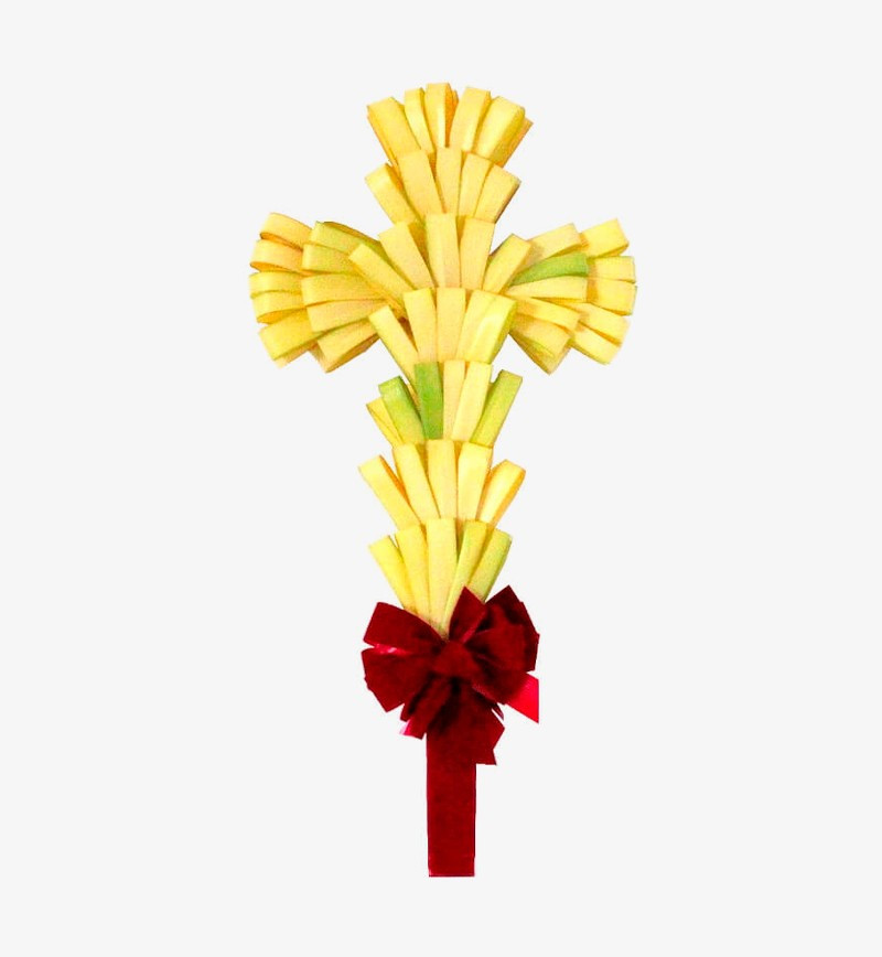 These Fresh 24" Processional Palm cross is handmade with pre-selected palm loops, wrapped with red velvet ribbon for your processional service on Palm Sunday. Double sided design.